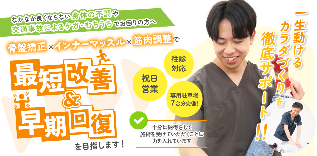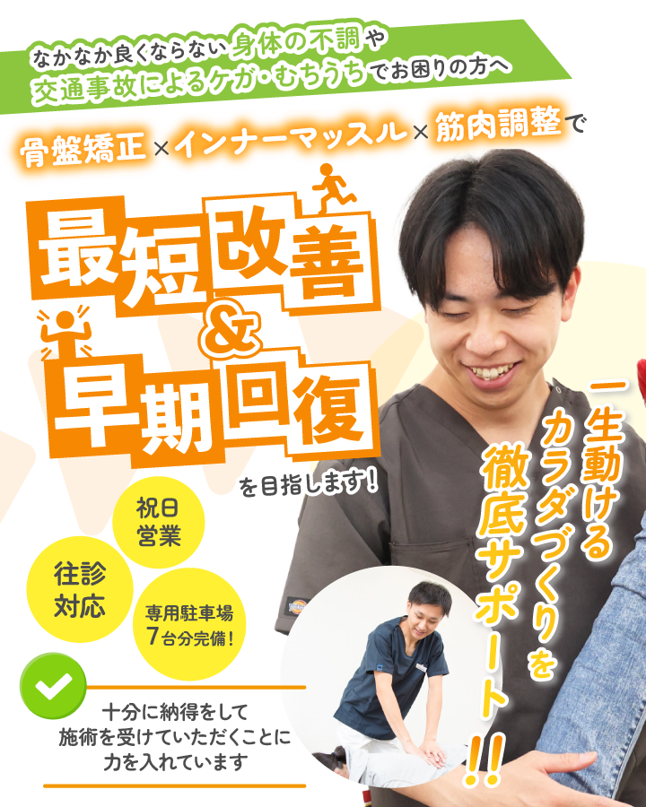 長井きずな整骨院では、患者様のニーズに合わせた保険診療や、骨盤矯正などの自費治療を組み込んで患者様のお悩みを解決するサポートを行います。 家事や育児でお忙しい方も、お子様と一緒にご来院することが可能です。キッズルームも完備しているので、安心してご来院ください。 自分の人生を楽しんでいただけるよう最高の施術を提供します。